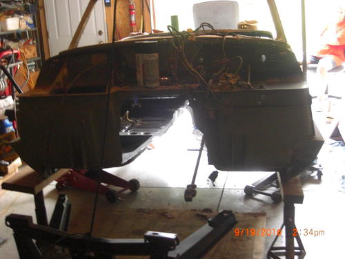 The boards are on the welded seam on the bottom, and 2 by 4, the large one I used had a tendency to get sideways. Brace the front and rear also. This let me get the firewall sanded in stages, as there are lots of things to catch you fingers, so taking time will save lots of cuts and broken finger nails. Plus here is where the rattle can of primer is a big time advantage, kind of a primer and protect as you have enough for the day.