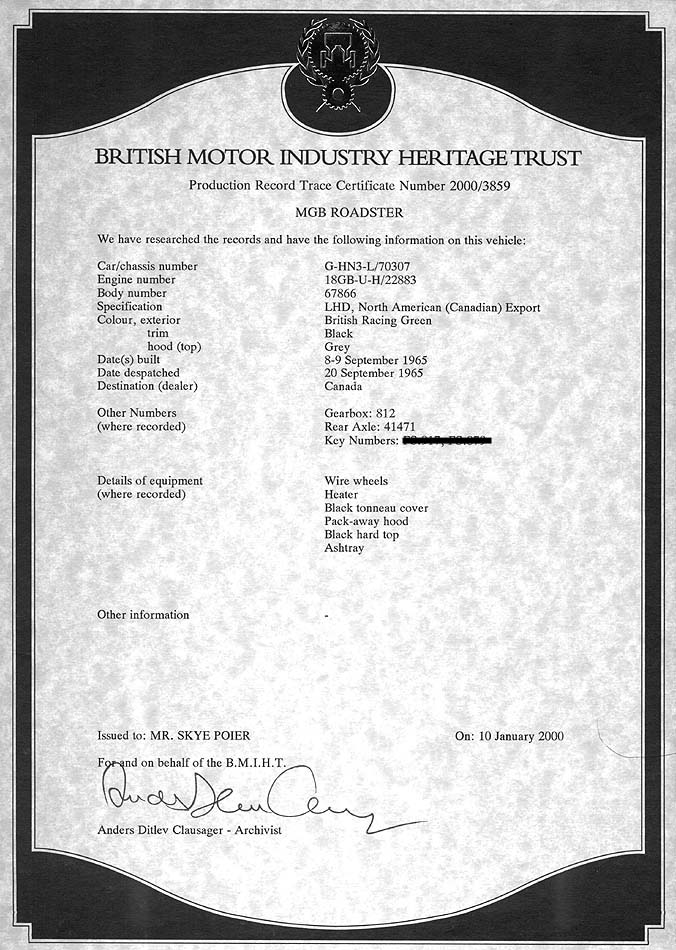 I also got my BMIHT Certificate in the mail a few weeks back. Rather than type it all in, here's a scan. $50 well spent! If you'd like your own, follow the BMIHT Certificate link under Registers below.
