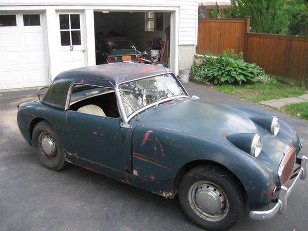 I found this Lost Soul about 13 years ago sitting behind a garage outside Albany, NY. I purchased her as an engagement present for my then fiance (now my wife of ten years). She was a project then and and still is now. When I first brought her home, she was smiling as she had been sitting for so long and now she was headed to a new home to get restored. Unfortunately, and I've said this way too many times in other write ups, life truly got in the way. I started buying parts for her (my wife named her Gabby) and I also started the task of tearing her down. However, I ended up changing jobs and my time and money weren't the same as they were just a few months earlier and so Gabby languished in our garage. A couple of years ago I came across a very well built rotisserie and knowing that Gabby would be needing floors and other underbody welding work, I purchased the rotisserie and got Gabby mounted to it. That was as far as it got and now I have even less time. We've decided that we need to find Gabby a new home. She is rough.. her time sitting alone in upstate NY certainly didn't do her underside any good, she is rusty. However, pretty much every panel needed to bring her back is available through sources like Moss, LBCC or the Bugeye Guy... and... She does come with a bunch of new parts and additional parts. I have the entire front floor, brand new from Moss; I have the rear "trunk" floor, new in the box and new sills, there are the closing panels for those as well, all from Moss. A new exhaust. Other bits included with the sale are a used bonnet, 1275 engine, the original 948 engine, 2 smooth side transmissions, 1 complete ribbed transmission, 1 ribbed case, a second set of doors, 3 sets of carbs, a second cowl w/hinges, plexi side curtains, and a second windshield. PLUS, the rotisserie.
