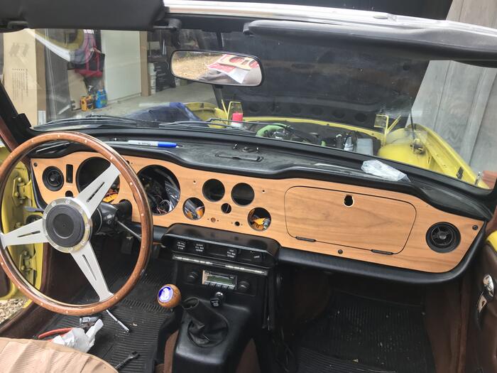 I fittied a 14” flat riveted wood laminate steering wheel, 205/15 red stripe radial tires and a new original style dash from TRF.